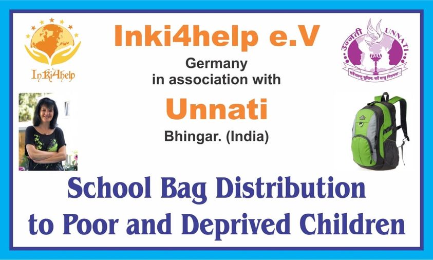 Dies ist ein Banner aus Ahmednagar. Dort spendete inki4help e.V. 150 Schultaschen, zuvor gingen 150 Schultaschen auch an Prerana NGO in Solapur